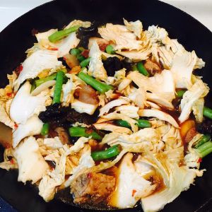 炖制至汤汁收紧,放入大白菜,等白菜变软后,加适量盐调味,即可出锅。