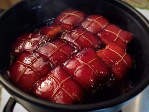 取出蒸好的东坡肉,浇上煮肉的原汁就可以了。