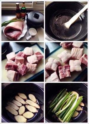 五花肉切大块,用棉绳系上,这样肉块久炖不散。 姜切片,葱切段,取一个大小合适的砂锅,用刷子抹一层油,然后铺一层姜片再铺一层小香葱。