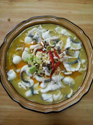酸菜加油爆香,之后放入盆中垫底,鱼在水中煮熟放入盆中。最后,高温烧油,放入花椒,浇在鱼上,洒入辅料。