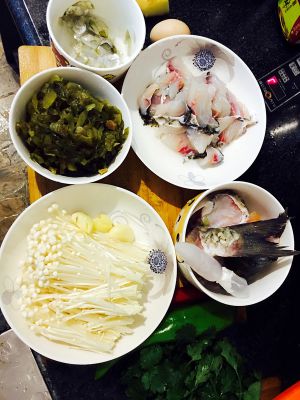 太迟了超市只有光鱼大小比较适合一个人吃,草鱼不好吃,黑鱼最适合哦 (我让师傅帮我把鱼分好切好片,鱼片加盐,轻轻揉搓洗干净重复3次,这样鱼片不易碎)(酸菜切好,开水先抄过)(金针菇洗好备用)(生姜大蒜备好)