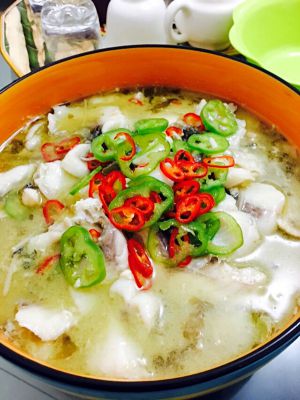 炒酸菜,热锅,少量油加少量蒜爆香。大火炒香炒熟 ,倒出。(注意不要和汤水一起煮。失去脆,香。而且影响汤色)加汤底烧开,看水量太少的话加些沸水,汤量大概是鱼片和酸菜的1.5倍。水开加鸡精,味精,鸡粉,糖。(注意不要盐,鱼片和酸菜带咸味较重。)然后汤倒在酸菜上。加沸水 ,加少量黄酒。胡椒粉 生姜,再加鱼片,慢慢推散,煮3分钟以上。控干水。鱼片盛入汤底和酸菜上,酸菜和鱼肉比例1:1,或者酸菜少点点也可以。然后在鱼片上依次加入 干辣椒(要切碎去籽,目的是增香,量大概是菜的十分之一)加入泡椒(泡椒是为了增辣味,喜欢辣可以多加些,也可以加入泡椒水)上面一层加入小葱(量大概是辣椒等份,目的是增香)