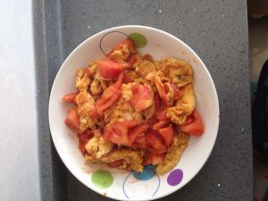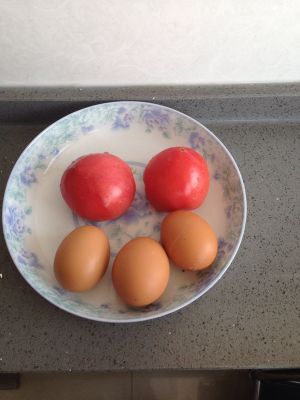 先来个材料图。一般标配是两个柿子四个鸡蛋,不过我家这柿子小,于是鸡蛋减一个。