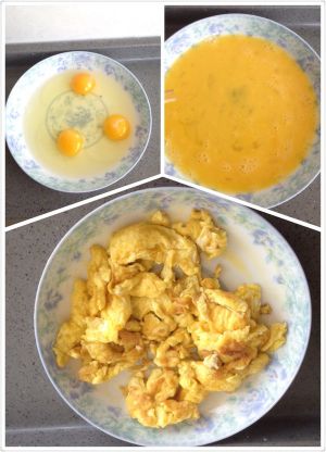 鸡蛋打入碗中加入少许的盐和鸡精搅拌!热锅倒油,放入鸡蛋液炒熟后盛出备用!