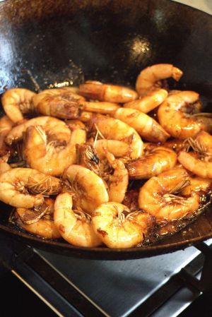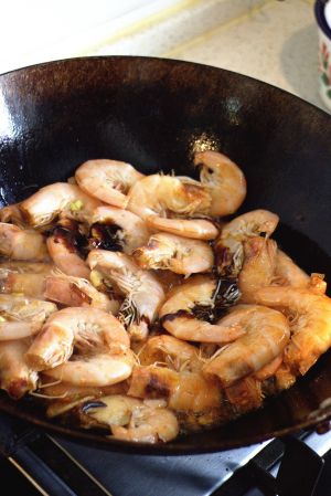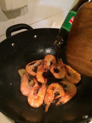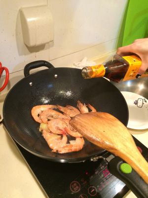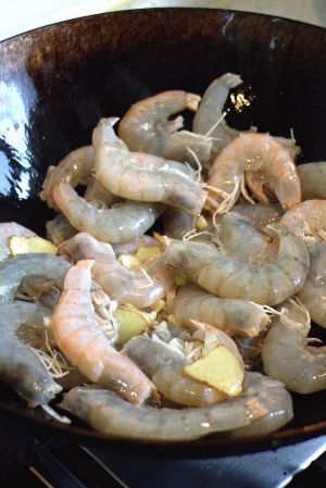 锅中加入食用油。油热后加入葱姜,出香味后将虾倒入锅中加入料酒翻炒。