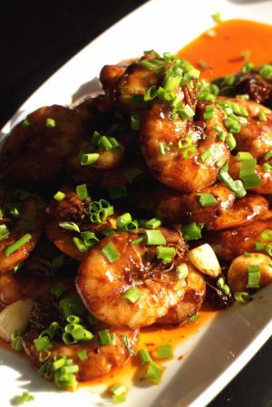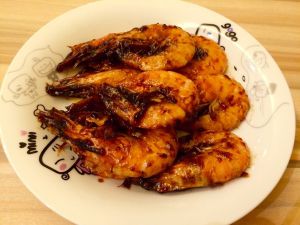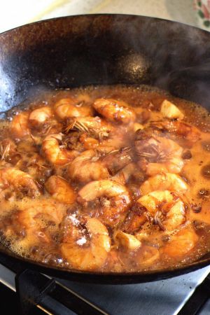 放底油,八角大葱姜爆香,蕃茄酱一大勺,多炒一会,大虾放入锅中,盐3g,糖15g,3-5min 收汁
