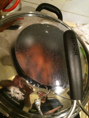 放入冰糖老抽翻炒以后,然后依次放入盐和糖翻炒,最后倒一点醋翻炒加水