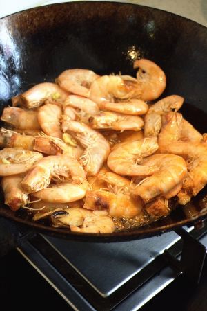把海虾丢进锅里,转中大火翻炒每隔1分钟翻炒一下。