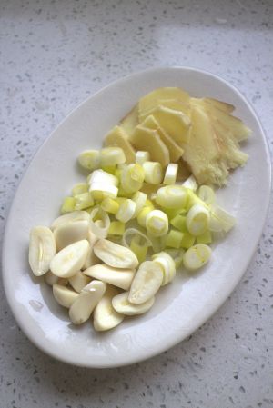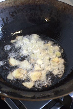冷油20毫升下锅,小火把大蒜和姜片爆出香味。