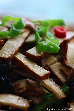 放入姜丝爆炒一会儿加入青椒丝爆炒,加入盐、鸡精。炒3---5分钟即可。