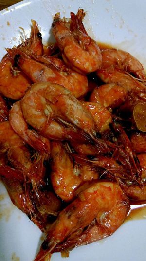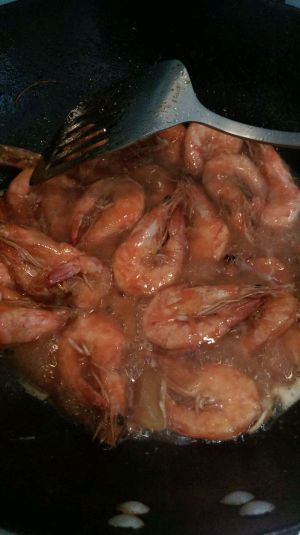 让虾在锅里时间长点,这样入味,甜咸口味的,自己尝一下汤汁的味道,适当调调味道,待汤汁浓了,裹在虾身上,关火出锅!