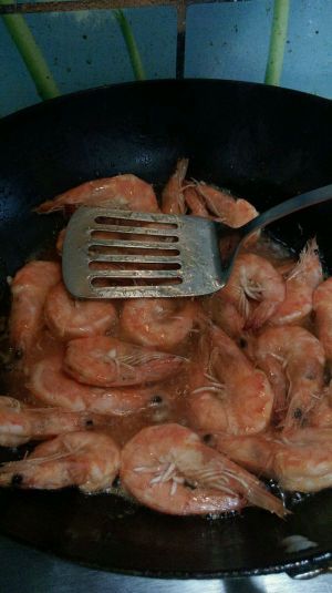 放入对虾、葱姜蒜、以及料酒、耗油。大火收汁。