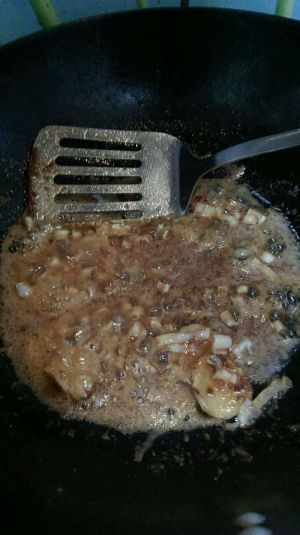 用炸虾剩下的油,放入姜葱,放入白糖,一直到糖化开,可以多放点糖,加入两勺盐,根据自己喜好酌量加入,加点清水,让汤汁稀释,注意火不要大,以免糊锅,待汤汁开锅倒入炸好的虾翻炒