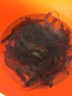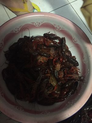 一般两斤多,买回来泡起来,反复清水透几次,放盐,让大虾把脏东西吐完,洗干净,然后把虾尾线去掉,用牙刷给虾子洗净,然后用剪刀把虾头脑部粉剪掉,不会的可以扫描我微信问我,所有工作到位,用淀粉,料酒把你整理好的大虾腌制一会,不需要太久,淀粉不要放多了