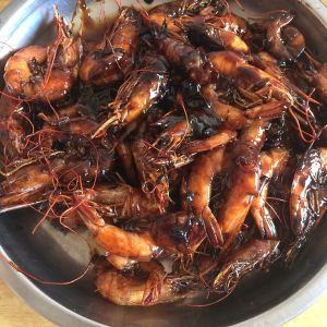 油烧开…分别倒入葱姜蒜…大虾…然后加入酱油生抽糖…炒到快干锅以后即可