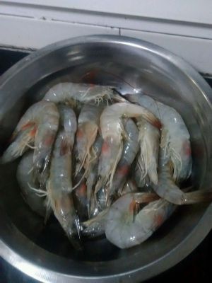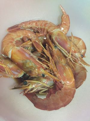 大虾剪去虾须和虾枪 开背清理干净 用少许料酒和生抽腌二十分钟
