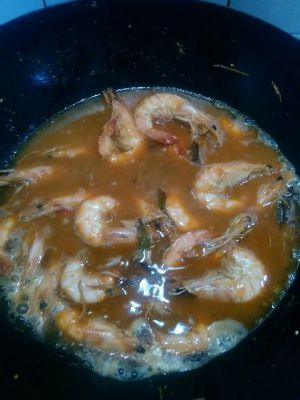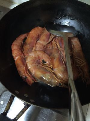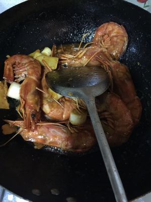 炒好葱姜蒜之后放入大虾,大虾变色后加红酒和水,这个时候把调料都加进去