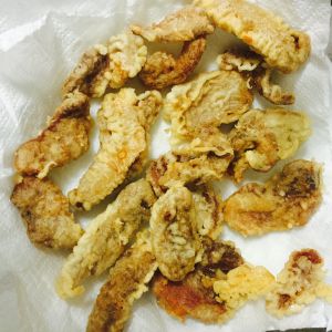 油烧到140度,将肉片蘸上玉米淀粉再在炸糊中裹一层,入锅炸至浮起,第一遍炸完捞出控油放置于厨房用纸上。颜色呈此