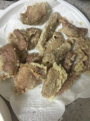 油热后炸肉片第一遍定型 凉凉,第二遍第三遍炸至金黄。捞出沥干油