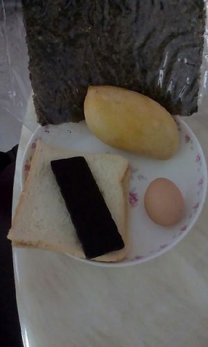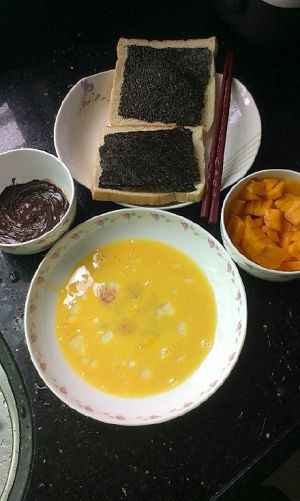 首先准备好吐司、鸡蛋、芒果、以及巧克力酱【家里没有酱可以拿巧克力去熔】(另外那张是紫菜,加不加看个人口味)