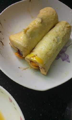 1.往锅里放少许油,热热锅 2.放下吐司卷(建议一个一个来,不然不好翻),大概30秒就行了 ※注意:要及时翻面不然会烧焦