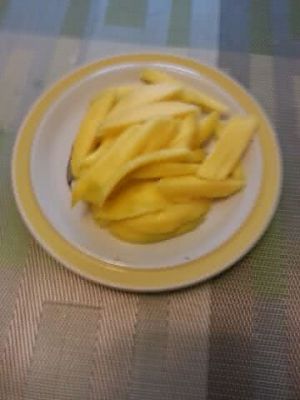 芒果,去皮,去核,切成条,待用。