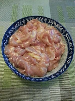 鸡大腿去皮,去骨切成鸡柳,用酒,盐,芡粉拌匀,待用。