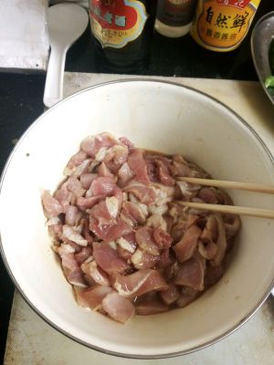 瘦肉切片,放入醋、老酒、酱油进行腌制