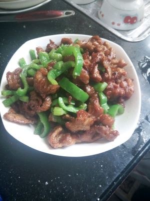 开火烧油,待油温暖手放入肉片炸,炸至红色为止捞出,把油倒到碗里,青椒下到锅里炒,待青椒炒熟时放入炸好肉片一起翻炒,炒出香味为止便可出国
