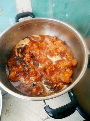 鸡肉推到一旁!下豆瓣酱,洋葱炒香!放生抽,老抽,冰糖适量!