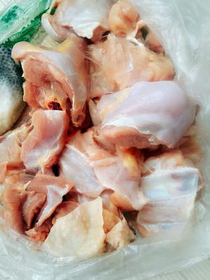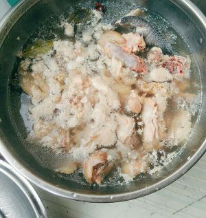 土鸡抄水,把上面漂浮物捞出,鸡汤不要倒了备用。
