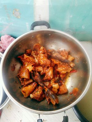 先用葱姜、八角把鸡块煸炒,鸡块表面呈现焦黄色,加生抽