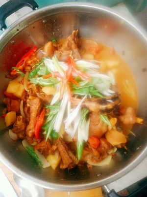 十分钟左右放入手擀粉,翻炒几下,放入青椒、大葱,放点鸡精,就可以出锅喽!