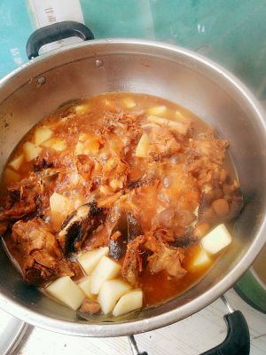 加黄豆酱油炒几下,加入开水,加入料包,再加入土豆中火煮一小时。