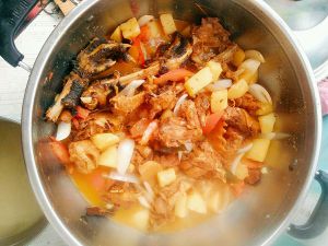 土豆快熟时,切一个西红柿和一个洋葱放进去