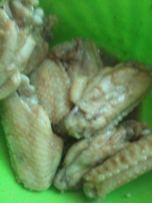 鸡翅用清水把血水泡出来后斩两段,用生抽、蚝油、姜丝、盐、糖、少许料酒腌渍一个晚上