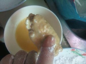 冰箱拿出隔天腌制的鸡翅,裹上一层炸鸡粉(粉里面可以加入少许盐和胡椒粉)再裹一层鸡蛋液还要再裹一层炸鸡粉,锅热小火慢炸,炸制颜色比较深金黄的时候捞出