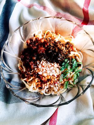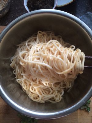 面条煮硬些捞出使劲甩甩尽量甩干些。(如能买着更细的面就更好了)放入一勺生抽拌匀再放适量香料油拌匀。(生抽不宜放多。后续放入的肉酱和芽菜都咸。要吃辣的就用辣椒油拌。