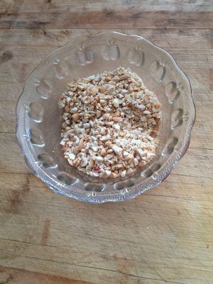 搓去花生皮,放保鲜袋用擀面棒碾碎。
