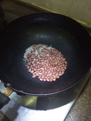 花生米用盐小火炒至颜色微黄,花生皮爆开,发出"噼啪"的响声时盛出花生米放凉。