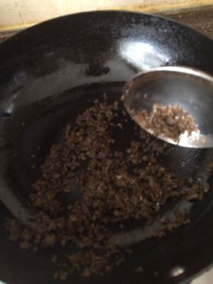 锅中少许底油,下肉馅儿炒散。然后放入姜末、适量花椒粉、鸡精和甜面酱炒匀即可关火盛出备用。