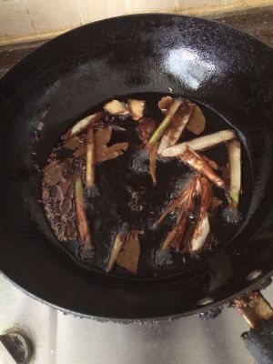 炼油 在菜油里面放少许的八角 山奈 花椒 干辣椒 爆香后倒入碗中备用