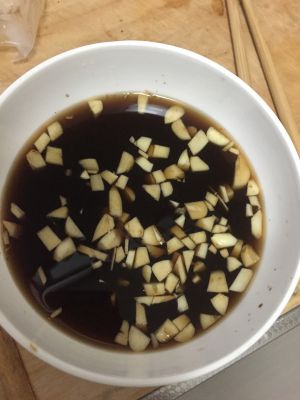 趁蒸面的时间,拿另一个空碗放陈醋、蒜、花椒水。