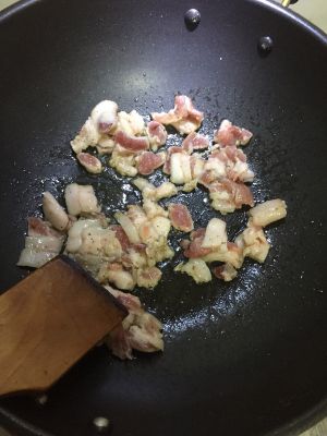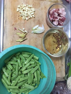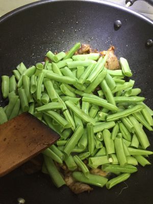 等五花肉炒出油,放扁豆。