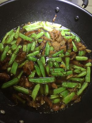 先把蒜爆香,肉煸炒熟,放入八角,倒入酱油,料酒,糖,然后放入扁豆煸炒到半熟。倒入开水,水面要没过扁豆