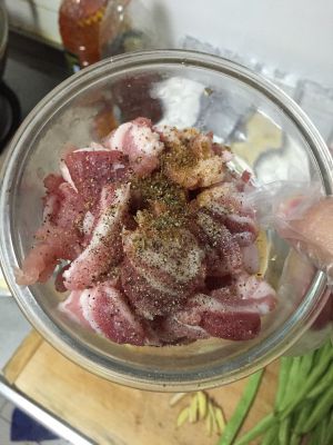 先将五花肉切片,之后腌制。窍门一就在介里啦~腌肉除了放料酒、盐、黑胡椒以外,放一点孜然粉,炒出来的肉会特别特别香。如果不喜欢的可以不放。腌制15分钟左右。