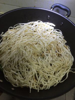 等到汤要烧干了,揭开盖子,先用筷子抖搂抖搂面条,但是不要翻身,然后顺着锅边绕着四周倒水,水面不要没面条