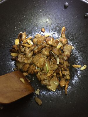 放葱姜蒜,放老抽、盐,把五花肉的油炒出来,这个时候你会发现肉特别的香,那就是孜然粉的功劳啦。