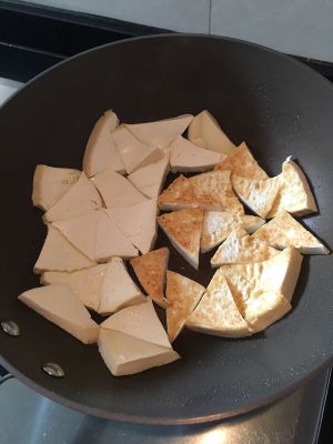 豆腐处理一下,切块,厚度自己把握好!油锅里煎至两面金黄......