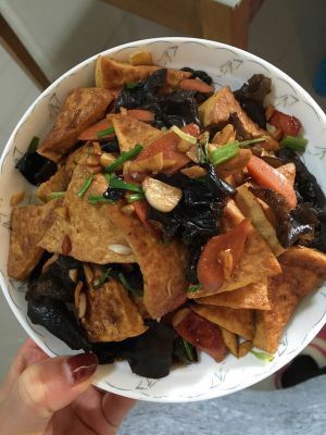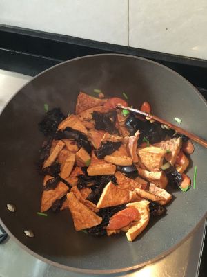 爆香葱姜,加肉丝翻炒变色上酱油,再下香菇炒炒,把煎好的豆腐放入,加小勺豆瓣酱,翻匀后兑入香菇水闷一下,撒入蒜叶子炒熟,出锅前先试试再下盐,一般放平时的三分之一就可以了。这个菜可以作为保留菜!美味